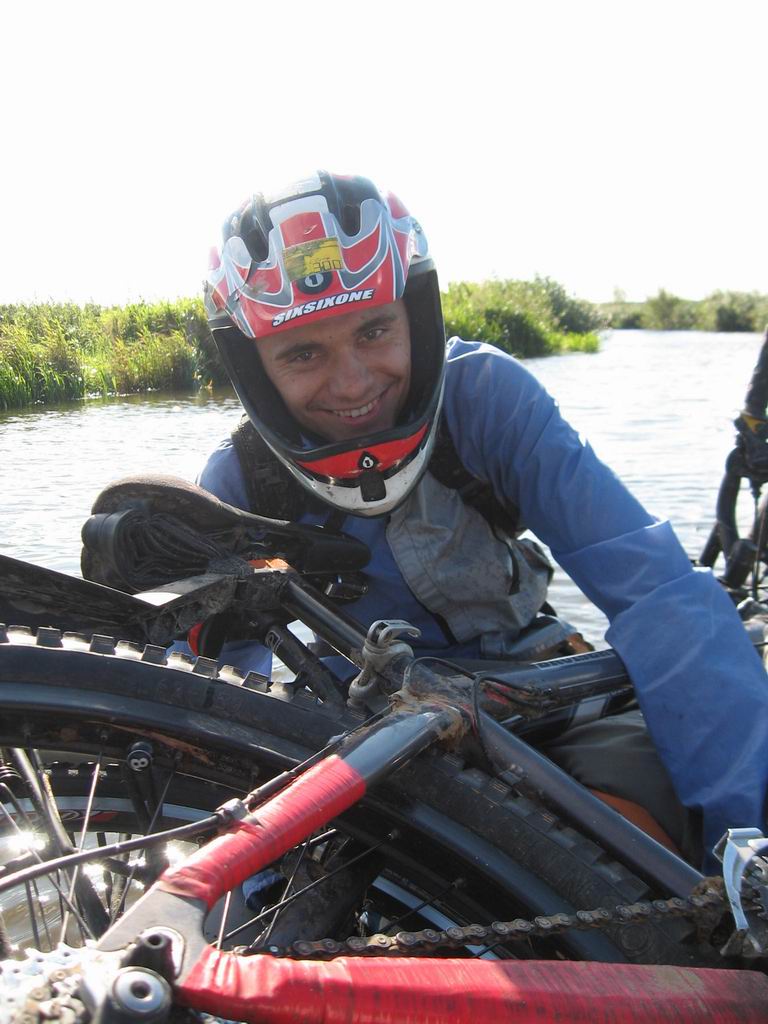 56. Денис Акифьев моет байк. Он ещё не знает, что скоро будет очень много воды...