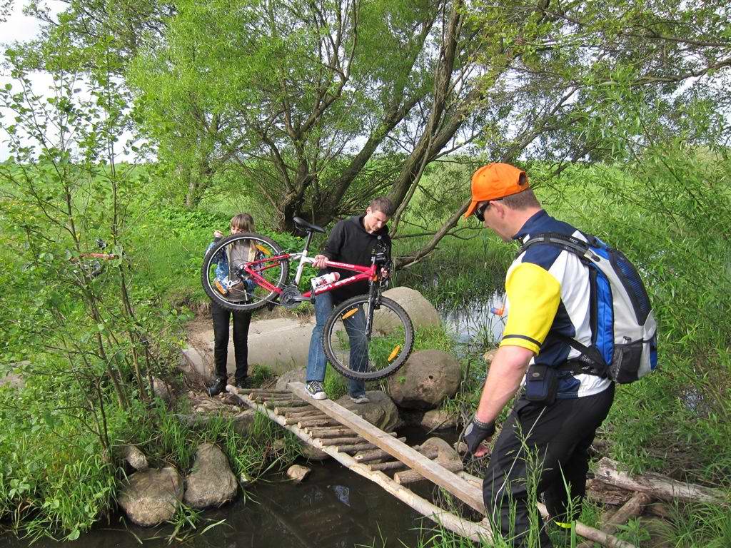 21. Артём переносит вел по остаткам моста