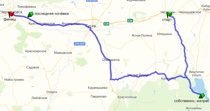 Дальше Гусев, магазин где кушаем холодный борщ, Черняховская трасса, микроостановка на мосту через Анграпу. Остановка на перекус в Краснополянском, где нас ждёт упиливший вперед Саша Ш. И... ловим звонки от уехавших в субботу двух групп - оказывается, они едут к нам по отдельности, но обе со стороны Озёрска, и ночевали они по отдельности, но в 7 км. друг от друга в Роминтской пуще - Бородин утащил Сергея на свое лежбище Ягдбуде, а Алексей с Ольгой на традиционном месте у маленького озерка близ Краснолесья. В общем, приехали все на поляну на берегу Анграпы, совместными усилиями уговорили месье Бородина приготовить нам щи, поужинали, накупались, посидели у костра и спать.