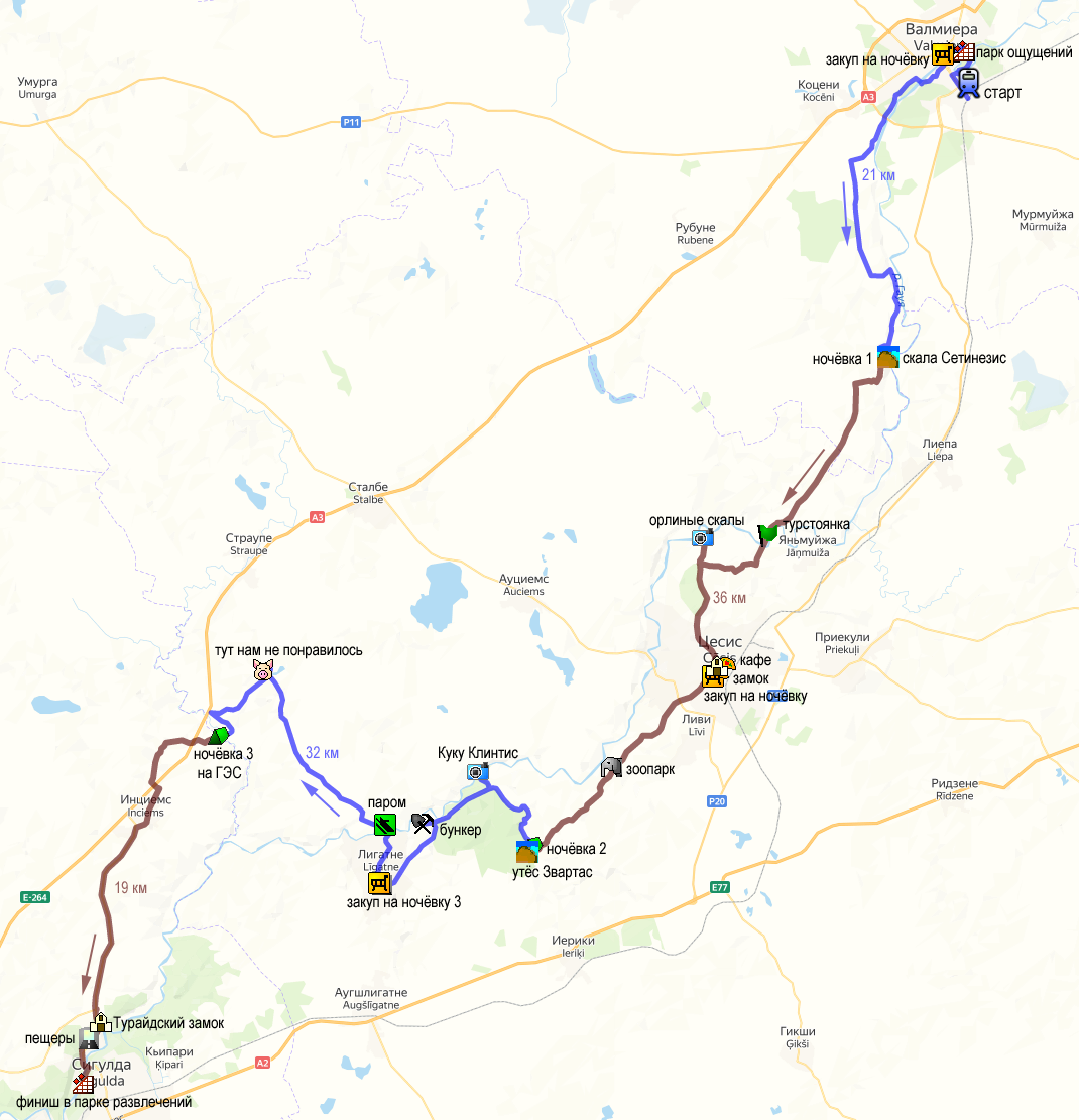 В этом году долго не могли определиться куда съездить на несколько дней в велопоход. И какое-то время Сергей хотел в Польшу на Мазуры. Но, посмотрев прогноз погоды, который рисовал осадки мы решили посетить национальный парк Гауя. В 2010 году, в середине осени, мы там были на тандеме, детей у нас тогда не было ещё. Но почему-то у меня очень смутные воспоминания были о той поездке, только помню, что мёрзла и был снег. Всё в воспоминания больше углубляться не буду, перейдем к только минувшему велопутешествию. 😊 Ранним утром среды 10.07.19 (около 4.00), мы выехали на машине из Советска. Направлялись в Сигулду, где планировали сесть на поезд, доехать до Валмиеры и уже оттуда начать велосипедную часть, держа путь к машине. Поднять детей было не самая легкая задача, но практически спокойно всё обошлось. 😊 Дорогой они естественно доспали и это позволило спокойно доехать до Сигулды с одной остановкой на заправке в туалет.